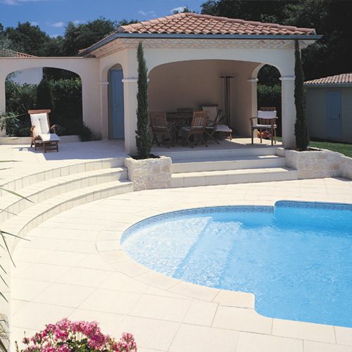 La pavimentazione intorno alla piscina subisce l’effetto della pioggia, del sole, del cloro e del gelo, per questo motivo deve essere particolarmente resistente.
